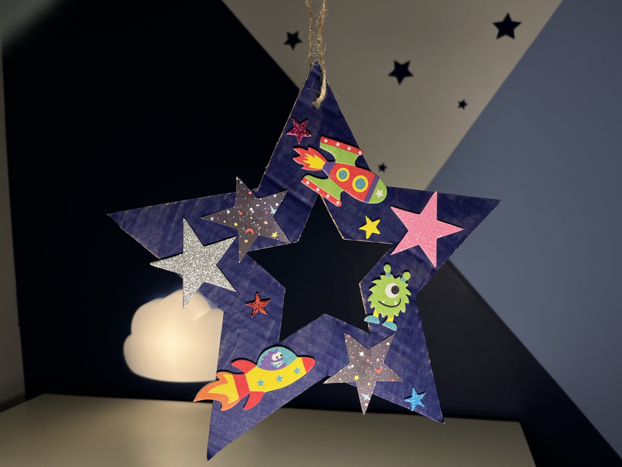 We used felt tip pens and space stickers to decorate our star wreath - perfect for decorating an aspiring astronaut’s bedroom door!